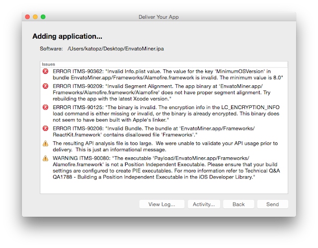 WARNING ITMS-90080: "The executable 'Payload/EnvatoMiner.app/Frameworks/Alamofire.framework' is not a Position Independent Executable. Please ensure that your build settings are configured to create PIE executables. For more information refer to Technical Q&A QA1788 - Building a Position Independent Executable in the iOS Developer Library."