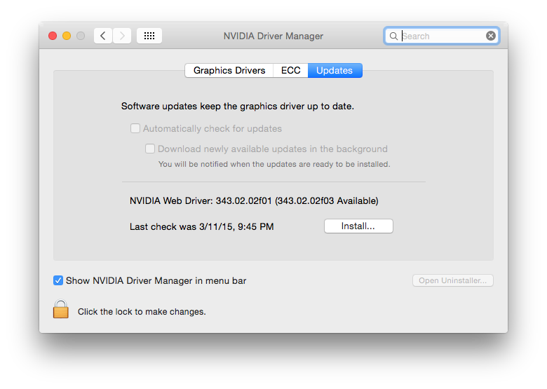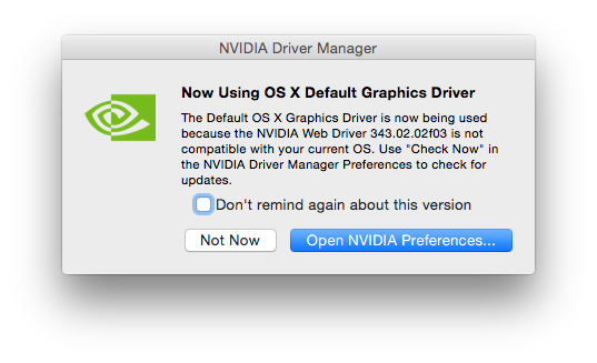 - Install http://www.nvidia.com/content/DriverDownload-March2009/confirmation.php?url=/Mac/Quadro_Certified/343.02.02f01/WebDriver-343.02.02f01.pkg&lang=us&type=GeForce